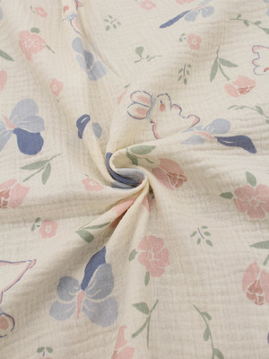 Муслин двухслойный "Полевые цветы на белом" (арт. M0253) - легкая ткань шириной 140 см из 100% хлопка, плотностью 120 г/м². Идеальна для детских аксессуаров и одежды. Жатый эффект, быстро сохнет и не требует глажки.